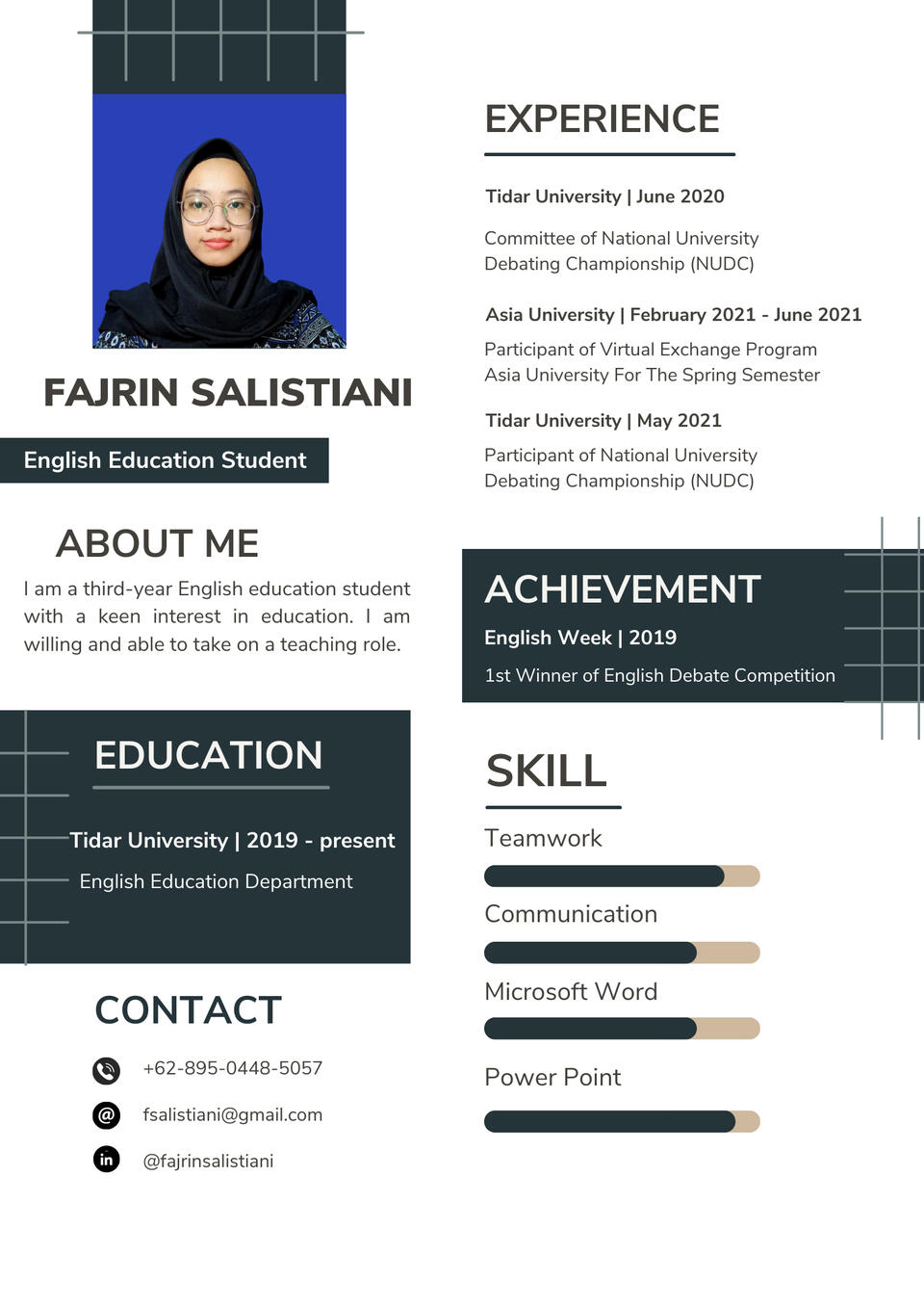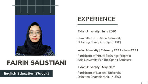 Hello! My name is Fajrin Salistiani and I am an undergraduate English Education student at Tidar University, Magelang, Central Java.It was a fantastic opportunity for me to join the PSU foreign teaching interns. I cannot believe I am making myself teach students from the Philippines. This course has given me invaluable experience, new friends, and the opportunity to study new languages. For the love of God, I will never forget this moment in my life.Teachers do much more than simply teach, and their influence goes even beyond the classroom. As teachers, we are more than just educators; we are mentors, confidants, and friends. One of the most prevalent motives for becoming a teacher is to make as many students' lives better as possible. We aspire to be a good teacher and learn greater experience in the field of education through our internship teaching at PSU.